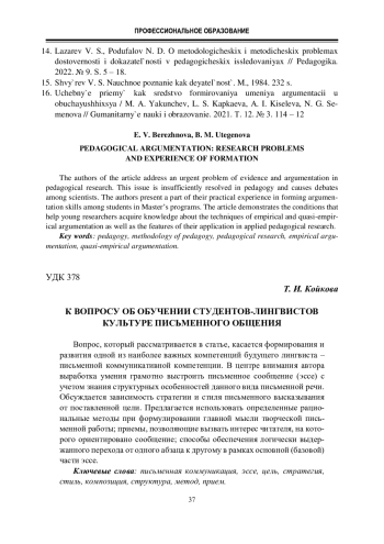 Авторы статьи обращаются к актуальной проблеме, недостаточно решенной в педагогике и вызывающей дискуссии ученых, – это проблема доказательства и аргументации. Они представляют часть своего практического опыта формирования умения аргументировать у обучающихся по магистерским программам. Показаны условия, которые помогают молодым исследователям в овладении знаниями о приемах эмпирической и квазиэмпирической аргументации, а также об особенностях их применения в прикладном педагогическом исследовании.