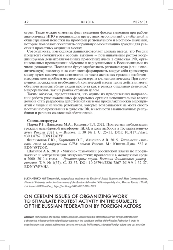1. Парма Р.В., Давыдова М.А., Кащенко Т.Л. 2022. Протестная мобилизация граждан на цифровой платформе TikTok в ходе выборов в Государственную думу России 2021 г. - Власть. Т. 30. № 1. С. 25-31. DOI: 10.31171/vlast.v30i1.8767 EDN: IZAIYP