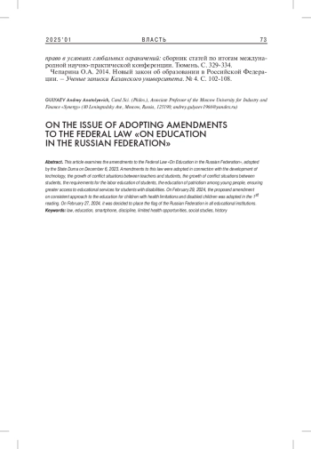 ГУЛЯЕВ А. А. К ВОПРОСУ О ПРИНЯТИИ ПОПРАВОК К ФЕДЕРАЛЬНОМУ ЗАКОНУ «ОБ ОБРАЗОВАНИИ В РОССИЙСКОЙ ФЕДЕРАЦИИ» // ВЛАСТЬ. 2025. ТОМ 33 № 1