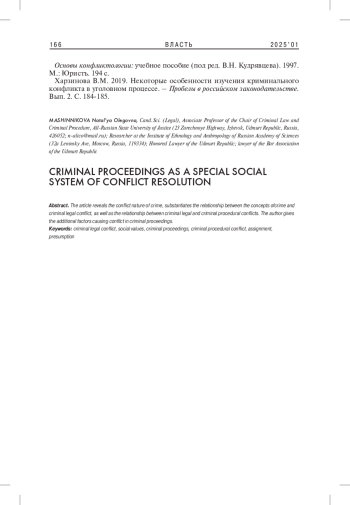 5. Харзинова В.М. 2019. Некоторые особенности изучения криминального конфликта в уголовном процессе. - Пробелы в российском законодательстве. Вып. 2. С. 184-185. EDN: QOMESY