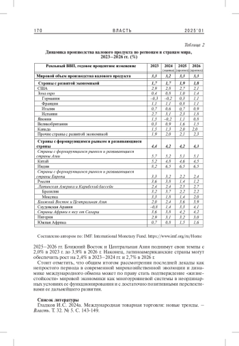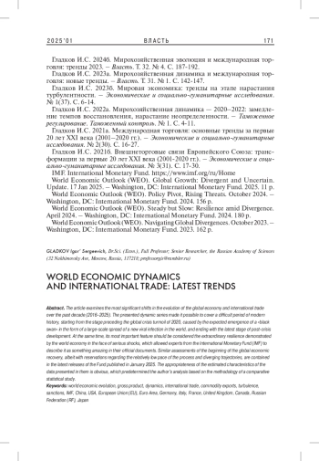 3. Гладков И.С. 2023а. Мирохозяйственная динамика и международная торговля: новые тренды. - Власть. Т. 31. № 1. С. 142-147. EDN: IRAAST