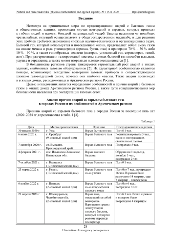 Рассматриваются проблемы, связанные с обеспечением безопасности населения при авариях с утечкой бытового газа, характерных для жилых домов Арктической зоны вследствие географических и климатических условий. Проведен анализ основных причин аварий с бытовым газом на территории России и сформулированы их особенности. Предлагаются пути усовершенствования мер безопасности посредством установки улучшенных газоанализаторов в квартирах с возможностью оповещения газовых охранных служб и жильцов, применения более совершенных технических средств тушения пожаров, способов ликвидации последствий разрушений и средств по экстренному спасению пострадавших из-под завалов при экстремально низких температурах воздуха.