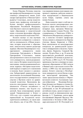 В статье сделана попытка охарактеризовать Е. Ю. Рогачеву в качестве известного деятеля педагогики и истории педагогики международного уровня, которая изучила, перевела с иностранных языков и ввела в научный оборот десятки и сотни архивных и малоизученных материалов, установила связи со многими зарубежными авторами. Вместе с этим для нас важно было отнести ее имя к той плеяде ученых, которые участвовали в кардинальной перестройке историко-педагогической науки на рубеже XX – XXI столетий, а также показать, что её роль в этом плане совершенно недооценена в нашей науке.