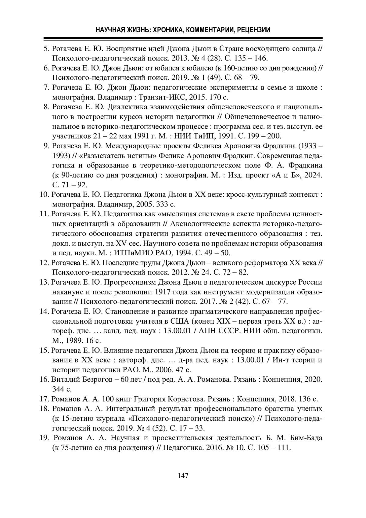 6. Рогачева Е. Ю. Джон Дьюи: от юбилея к юбилею (к 160-летию со дня рождения) // Психолого-педагогический поиск. 2019. № 1 (49). С. 68 - 79.