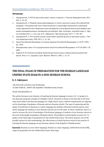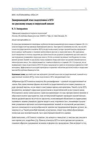 ЗАКИРЬЯНОВ К. З. ЗАВЕРШАЮЩИЙ ЭТАП ПОДГОТОВКИ К ЕГЭ ПО РУССКОМУ ЯЗЫКУ В НЕРУССКОЙ ШКОЛЕ // ДОКЛАДЫ БАШКИРСКОГО УНИВЕРСИТЕТА. 2024. Т. 9 № 2