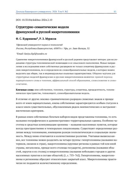 Сравнение микротопонимики французской и русской деревни представляет интерес для исследования структуры топонимической номинации и ее смыслового наполнения. Новые направления в исследовании имен собственных расширили не только семантику французских и русских микротопонимов, но и определили их словообразовательные модели, в которых можно выделить как общие, так и индивидуальные языковые характеристики. Общими чертами для структурных моделей французских и русских микротопонимов являются: прямой переход нарицательного слова в топоним, аффиксальный способ образования, словосложение и словосочетание.