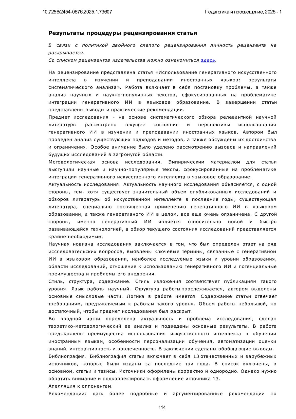 Статья посвящена применению генеративного искусственного интеллекта (ИИ) в изучении и преподавании иностранных языков. В последние годы ИИ активно внедряется в образовательный процесс, предлагая персонализированные подходы, автоматизированную оценку знаний и интерактивные методы обучения. Авторы анализируют существующие исследования и выделяют основные направления использования генеративного ИИ: чат-боты, диалоговые системы, платформы для обучения письму и адаптивные образовательные технологии. В заключение формулируются практические рекомендации для преподавателей, исследователей и образовательных организаций по интеграции генеративного ИИ в языковое образование. Работа подчеркивает важность дальнейших исследований и сотрудничества между учеными, педагогами и разработчиками технологий для эффективного использования ИИ в образовательном процессе. В качестве проблемы, особенно важной для отечественной системы образования, обозначается задача формирования этических принципов, обозначающих границы допустимого в использовании генеративного ИИ преподавателями и студентами. Методически статья выполнена в жанре систематического обзора. Критерии отбора источников включали год публикации (с 2017 по 2024 год) и тип публикаций (теоретические статьи, эмпирические исследования, обзорные статьи, технологические обзоры, редакционные мнения и дискуссионные статьи). Хотя существует значительный объем опубликованных исследований и обзоров литературы об искусственном интеллекте (ИИ) в последние годы, существующая литература, специально посвященная применению генеративного ИИ в языковом образовании, а также генеративного ИИ в целом, все еще очень ограничена. На основе проведенного обзора в статье сформулирован ряд рекомендаций. Во-первых, педагогическим работникам стоит рассмотреть возможность включения инструментов генеративного ИИ в свою педагогическую практику, оставаясь при этом бдительными и внимательными к потенциальным рискам. Непрерывное профессиональное развитие имеет решающее значение для обеспечения обоснованных решений и эффективной интеграции инструментов генеративного ИИ. Во-вторых, исследователям необходимо продолжать эмпирические исследования эффективности и влияния инструментов генеративного ИИ для развития конкретных языковых навыков и вовлечения заинтересованных сторон в ответственную интеграцию. Наконец, обществу в целом стоит учитывать, что влияние генеративного ИИ выходит за рамки языкового образования; важно рассматривать его интеграцию в другие предметные области.