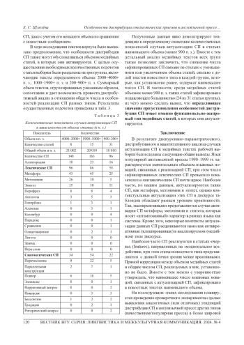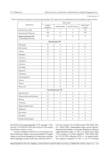 Данная работа посвящена актуальным вопросам текстоформирования в дискурсе разных типов и направлена на выявление общих тенденций реализации стилистических приемов (СП) в текстах медиа. Исследование указанной проблематики осуществлено с применением методик дискурсивно-параметрического, количественного и дистрибутивного анализа. Материалом для анализа послужила репрезентативная выборка статей из тиражных англоязычных таблоидов 1990-1999 гг., что в дальнейшем позволит рассмотреть явление в диахронической перспективе. В результате анализа сделан вывод об активности реализации СП в текстах популярной англоязычной прессы, при этом число лексических СП, по нашим данным, значительно превысило количество установленных случаев активации синтаксических СП. Также было сделано наблюдение о градуальном характере реализации лингвокреативного потенциала наиболее частотных СП (а именно метафоры, метонимии и эпитета), вследствие чего контекстуальные актуализации данныхСП в дискурсе медиа могут оцениваться как мало-, высоко- и антикреативные. Антикреативными мы считаем такие лингвокреатемы, которые обладают сниженным креативным потенциалом в дискурсе выбранного типа, но при этом их креативный потенциал может существенно возрастать при реализации в дискурсах других типов, например, в художественном. Анализ зависимости дистрибуции СП от таких показателей, как функционально-жанровый тип статьи (по Т. Г. Добросклонской) и ее объем, позволяет заключить, что наибольший объем языковых новаций, связанных с актуализацией СП, содержится в статьях-очерках (features), реализующих, помимо информирования, функцию оценки и эмоцонального воздействия на реципиента.