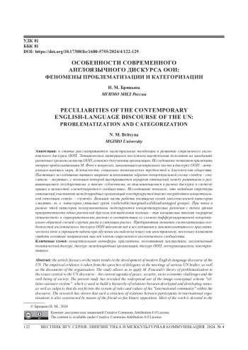 9. Брицына Н М. Англоязычный дискурс ООН: особенности и практическое применение в описании современного миропорядка // Филологические науки в МГИМО. 2022. №. 3. С. 70-81. EDN: RLAKAM