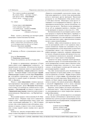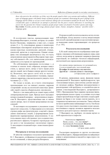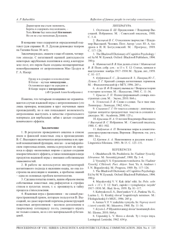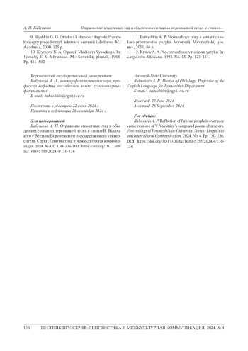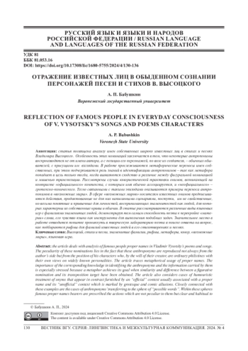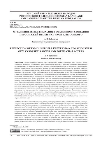 БАБУШКИН А. П. ОТРАЖЕНИЕ ИЗВЕСТНЫХ ЛИЦ В ОБЫДЕННОМ СОЗНАНИИ ПЕРСОНАЖЕЙ ПЕСЕН И СТИХОВ В. ВЫСОЦКОГО // ВЕСТНИК ВОРОНЕЖСКОГО ГОСУДАРСТВЕННОГО УНИВЕРСИТЕТА. СЕРИЯ: ЛИНГВИСТИКА И МЕЖКУЛЬТУРНАЯ КОММУНИКАЦИЯ. 2024. № 4