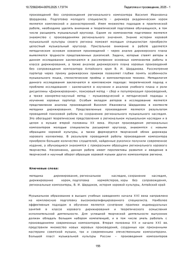 Ключевые фразы: методика дирижирования, региональное наследие, СОХРАНЕНИЕ НАСЛЕДИЯ, дирижирование хором, подготовка хормейстеров, хоры без сопровождения, региональные композиторы, в и шардаков, история хоровой культуры, АЛТАЙСКИЙ КРАЙ