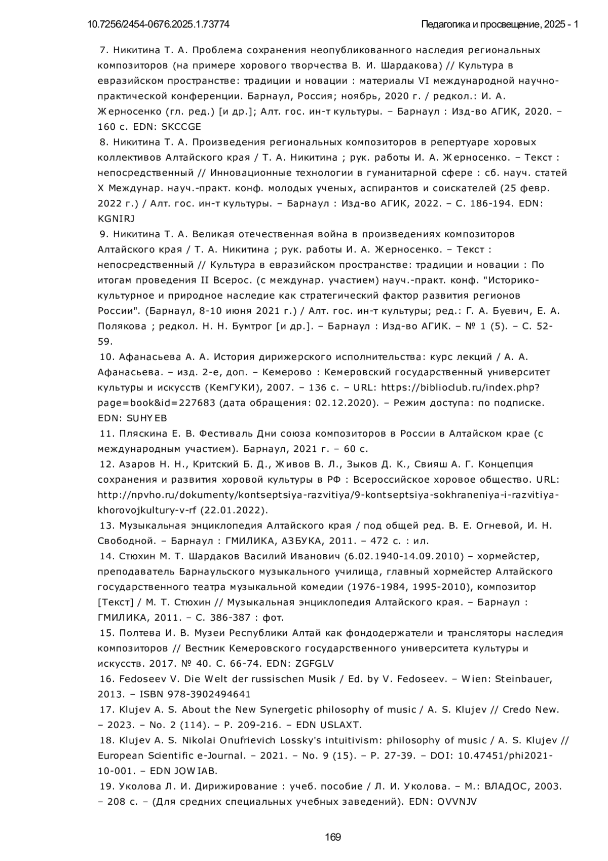 НИКИТИНА Т. А., АФАНАСЬЕВ А. М., ЛАПИНА Ю. С. ИЗУЧЕНИЕ СОЧИНЕНИЙ РЕГИОНАЛЬНОГО АВТОРА В КЛАССЕ ДИРИЖИРОВАНИЯ: МЕТОДИЧЕСКИЕ АСПЕКТЫ // ПЕДАГОГИКА И ПРОСВЕЩЕНИЕ. 2025. № 1