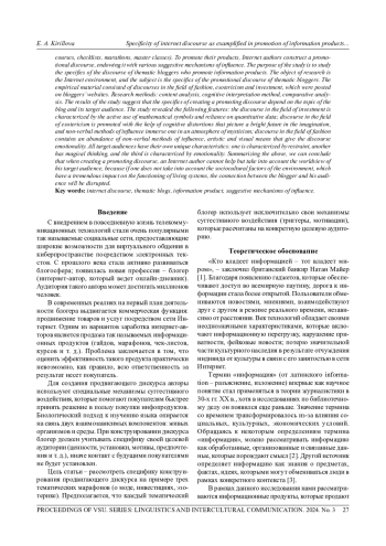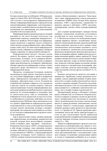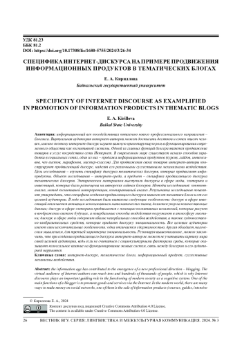Статья: СПЕЦИФИКА ИНТЕРНЕТ-ДИСКУРСА НА ПРИМЕРЕ ПРОДВИЖЕНИЯ ИНФОРМАЦИОННЫХ ПРОДУКТОВ В ТЕМАТИЧЕСКИХ БЛОГАХ (2024)
