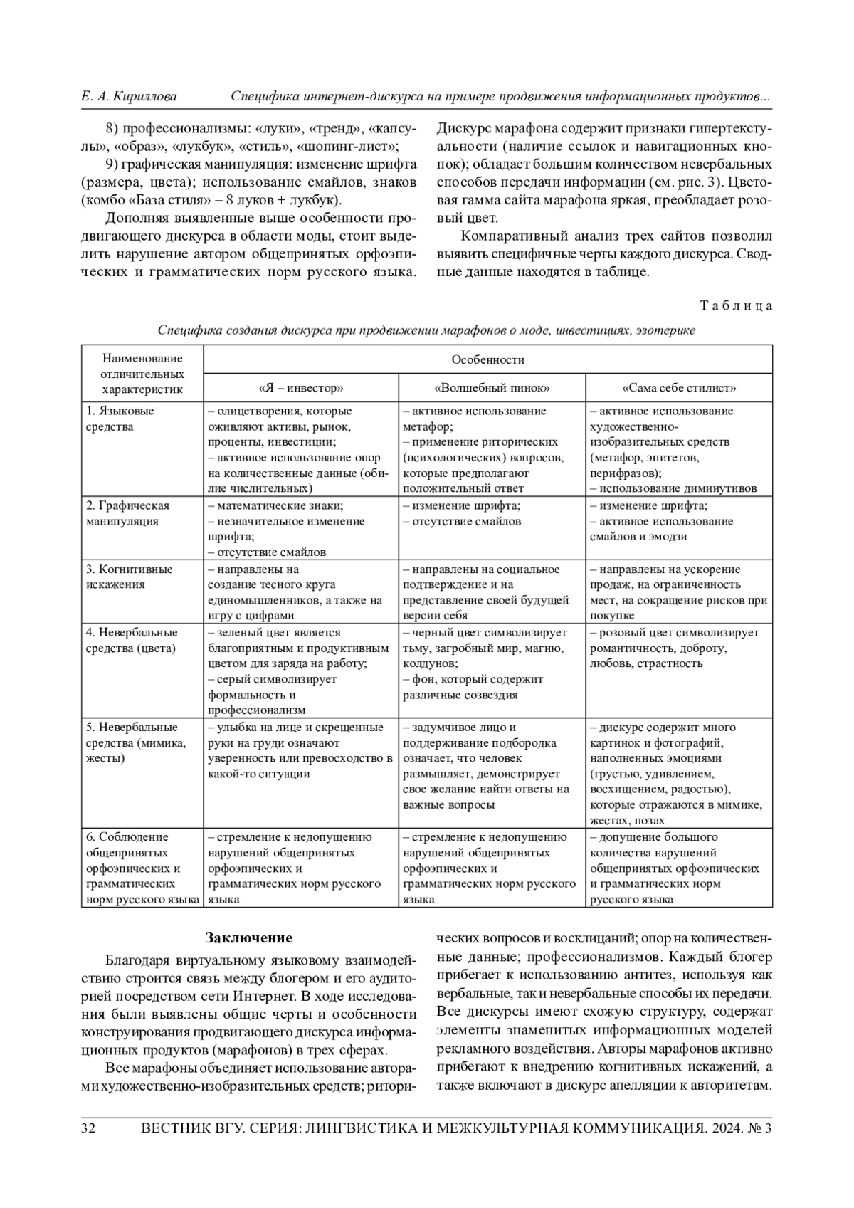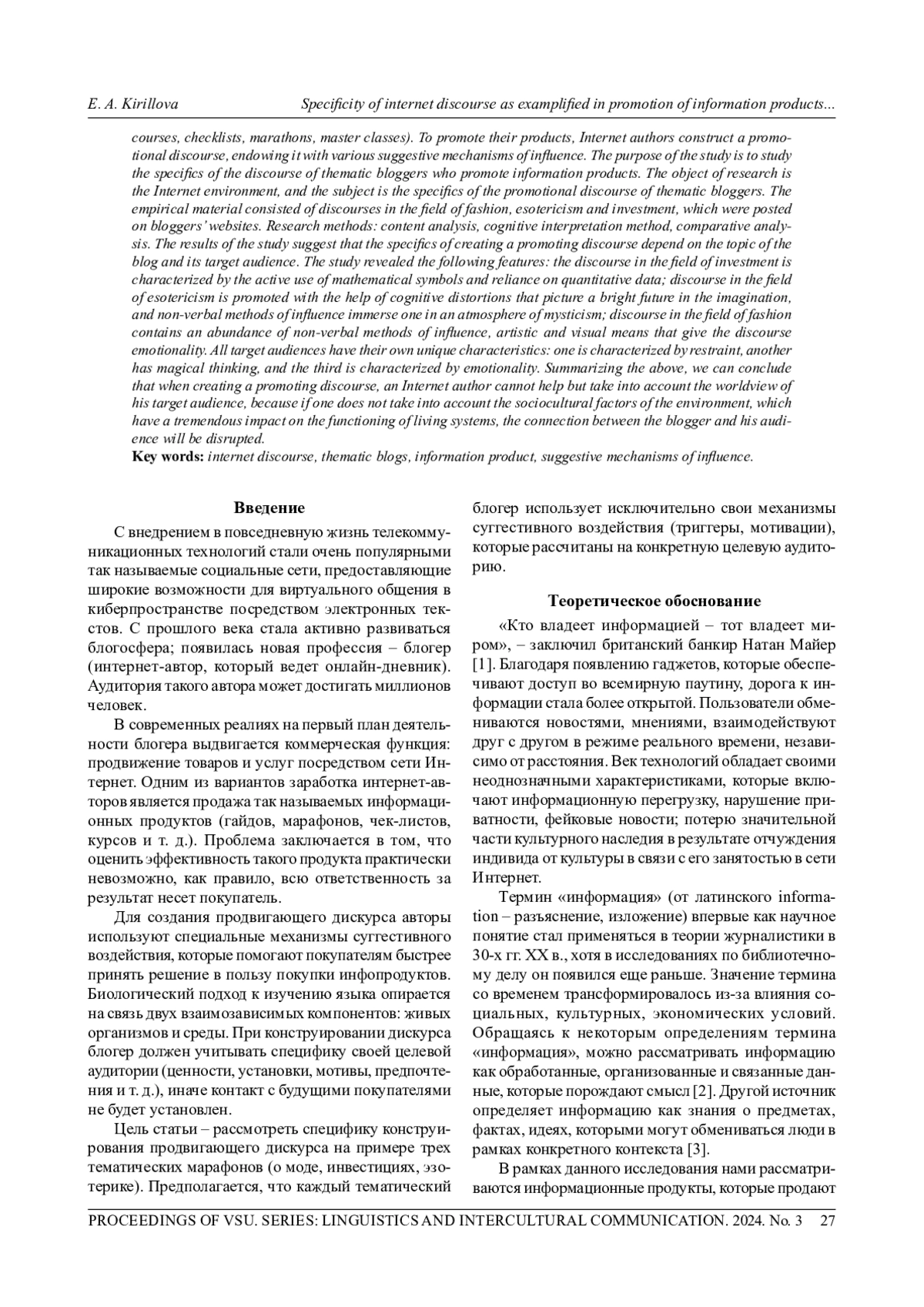 КИРИЛЛОВА Е. А. СПЕЦИФИКА ИНТЕРНЕТ-ДИСКУРСА НА ПРИМЕРЕ ПРОДВИЖЕНИЯ ИНФОРМАЦИОННЫХ ПРОДУКТОВ В ТЕМАТИЧЕСКИХ БЛОГАХ // ВЕСТНИК ВОРОНЕЖСКОГО ГОСУДАРСТВЕННОГО УНИВЕРСИТЕТА. СЕРИЯ: ЛИНГВИСТИКА И МЕЖКУЛЬТУРНАЯ КОММУНИКАЦИЯ. 2024. № 3