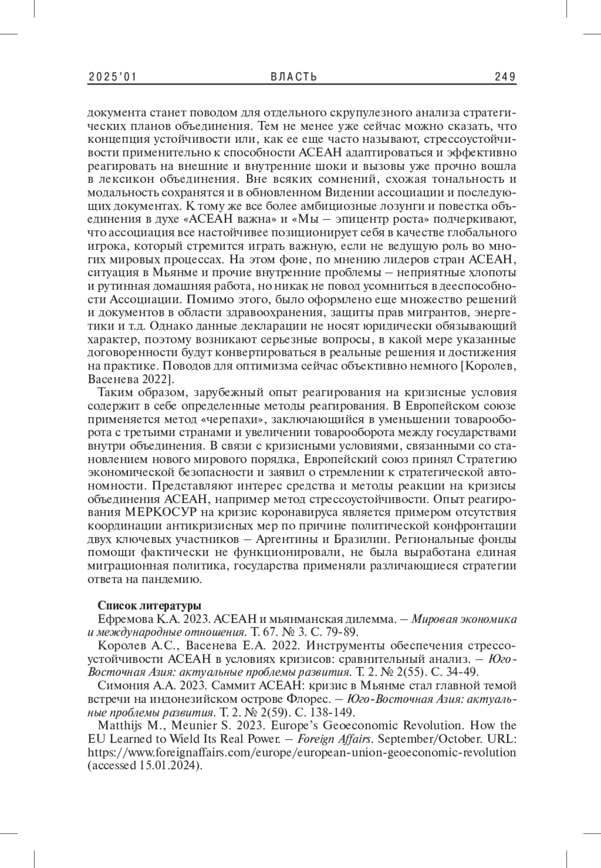 2. Королев А.С., Васенева Е.А. 2022. Инструменты обеспечения стрессоустойчивости АСЕАН в условиях кризисов: сравнительный анализ. - Юго-Восточная Азия: актуальные проблемы развития. Т. 2. № 2(55). С. 34-49. EDN: KCZFXS