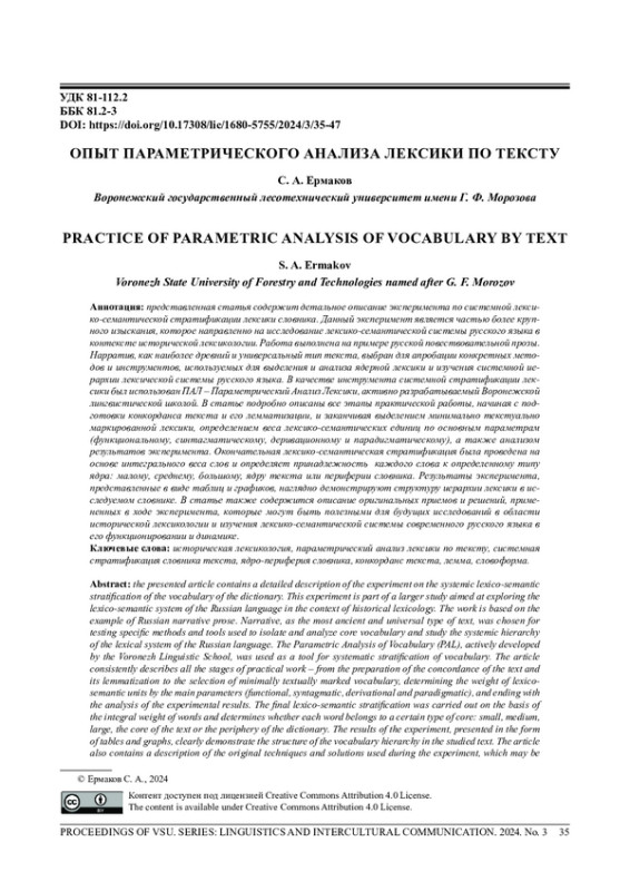 3. Кретов А. А., Ермаков С. А. Об исторической лексикологии русского языка по текстам // Вестник Воронеж. гос. ун-та. Сер.: Лингвистика и межкультурная коммуникация. 2024. № 1. С. 113-121. EDN: DITUBE