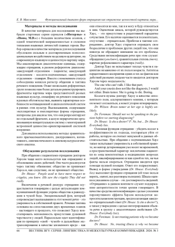 Статья отражает результаты анализа профессионально-ориентированного речевого дискурса двух языковых личностей из разных социокультурных сред, но имеющих схожее образование и профессию. Анализ был направлен на выявление интегральных и дифференциальных признаков внутри фрагментов ценностной картины мира разных стран, ценностных доминант, детерминирующих речевое поведение данных языковых личностей. Сравнительный анализ высказываний, эксплицитно или имплицитно содержащих отрицания в рамках диалогических единиц, позволил нам описать функциональный диапазон речевых тактик и стратегий, соотношение задач прагматического характера с ценностными ориентирами, которые детерминируют специфику речевого и неречевого поведения говорящего, особенности мотивационной и аксиологической систем на разных уровнях общения в рамках профессиональной иерархии. Особое внимание уделяется эмоциональному фону, сопровождающему отрицания, и сравнительному анализу психоэмоциональных реакций на всех этапах исследования речевого дискурса говорящих. Для анализируемых личностей характерен девиантный тип поведения, интересный для анализа тем, что регулярно выходит за рамки нормы, тем самым демонстрирует нетипичный функциональный диапазон языковых средств в типичных коммуникативных ситуациях. В результате анализа был обнаружен ряд общих характеристик, таких как преданность профессии, защита личного пространства, уверенность в собственной правоте. Прибегая к схожим речевым тактикам и стратегиям, доктор Быков и доктор Хаус транслируют совершенно разные ценности. Доктору Хаусу присущ в большей степени индивидуализм, его мало волнуют проблемы и эмоции других. Доктор Быков, наоборот, ощущает ответственность за всех и за все, что происходит в его отделении, для него имеет значение не только собственная рефлексия, но рецепция внешнего мира, что свидетельствует о тесной корреляции индивидуальной и национальной картин мира.