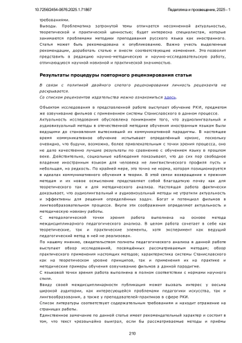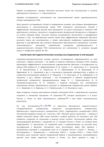 В статье представлены возможности интеграции действенного анализа, принятого в академической театральной методологии, и его главной составляющей - этюдного метода - в практику РКИ. Автор предлагает качественно новый уровень озвучивания инофонами художественных фильмов и мультфильмов, основанный на понимании природы конфликта каждой сцены, предлагаемых обстоятельств, психологии взаимоотношений персонажей, их характеров, мотивов, сверхзадачи. Обозначенные положения стали предметом исследования авторской программы «Я понимаю!», прошедшей апробацию в 6 вузах России и КНР. В статье представлены алгоритмы работы программы, а также варианты заданий и разборов на примере рассмотренного в учебнике «Я понимаю!» фильма Олега Янковского по мотивам пьесы Надежды Птушкиной «Приходи на меня посмотреть». В статье рассматриваются возможности применения основных положений «системы Станиславского» на уроках русского языка как иностранного в ходе работы со студентами-инофонами уровня В1-В2 над озвучиванием художественных фильмов и мультфильмов. За основу взято изобретение К. С. Станиславского последних лет жизни - этюдный метод, на котором базируется действенный анализ драматургического материала. Научная новизна исследования заключается в верификации гипотезы о том, что действенный анализ, принятый в академической театральной методологии, может быть эффективным средством обучения русскому языку как иностранному, а прием озвучивания инофонами художественных фильмов и мультфильмов при условии выборочного и методически обоснованного применения «системы Станиславского», расширяет современное понимание аудиовизуального и аудиолингвального методов РКИ возможностью его применения в условиях высшей школы с инофонами уровня В1-В2 и заменой понятия «механическое копирование звучащей речи» на «осознанное озвучивание». Как практический результат инофон понимает, почему эталонная речь артиста звучит именно так, как она звучит в художественном фильме; и переозвучивает персонажей не путем копирования речи носителя языка, а методом глубокого анализа драматургического и языкового материала.