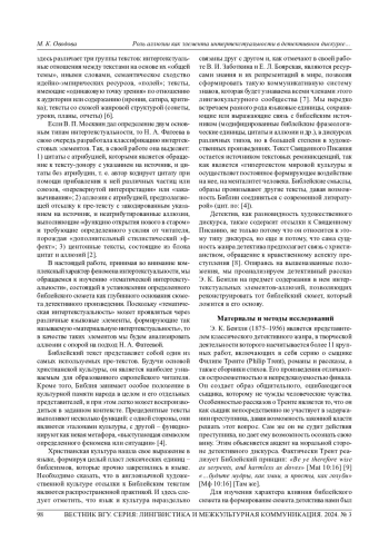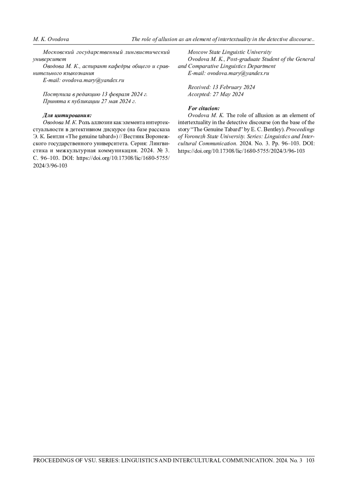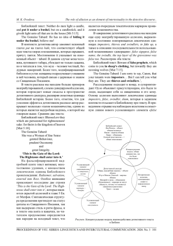 Данная статья посвящена исследованию интертекстуальных элементов в детективном дискурсе. Интертекстуальность, являясь «диалогом» двух текстов, представляет собой двуплановую структуру, разделяясь на материальную и тематическую. Данные типы интертекстуальности выражаются в заимствованиях элементов плана выражения (слово или его вариант) и плана содержания текста (сюжеты, мотивы, темы, образы) соответственно. В работе мы обращаемся к изучению тематической интертекстуальности для установления библейского сюжета, являющегося основанием детективного рассказа. Для достижения поставленной задачи анализируется аллюзия, которая, будучи одним из показателей материальной интертекстуальности, представляет собой скрытый тип заимствования элементов, по которым реципиент узнает исходный текст. В исследовании делается акцент на выявление библейских аллюзий, поскольку Библейский текст является самым используемым претекстом в европейской культуре, и сам детективный дискурс, содержа отсылки к Священному Писанию, предполагает связь с христианскими ценностями. В качестве источника материала выступает рассказ Э. К. Бентли «The Genuine Tabard». Анализ рассказа построен по алгоритму, состоящему из четырех шагов: определение библейского сюжета; сопоставление характерных черт героев; установление языковых средств, подтверждающих связь с исходным текстом; установление неатрибутированных аллюзий. Выявленные аллюзии имеют разную степень имплицитности: легко декодируемые, выраженные через библейские фразеологические единицы, и трудно декодируемые (неатрибутированные), проявляющиеся через изменение части речи, синонимичные конструкции и слова, смысловую корреляцию и синтаксическую структуру предложений, дешифровка которых требует от читателя определенного культурного фонового знания. В ходе анализа были установлены два основных типа аллюзий: способствующие трансформации библейского сюжета, и аллюзии, позволяющие реконструировать библейский сюжет в детективном дискурсе.