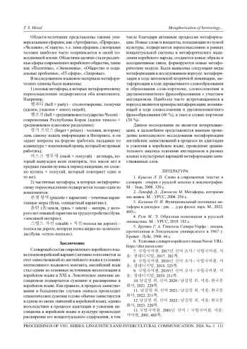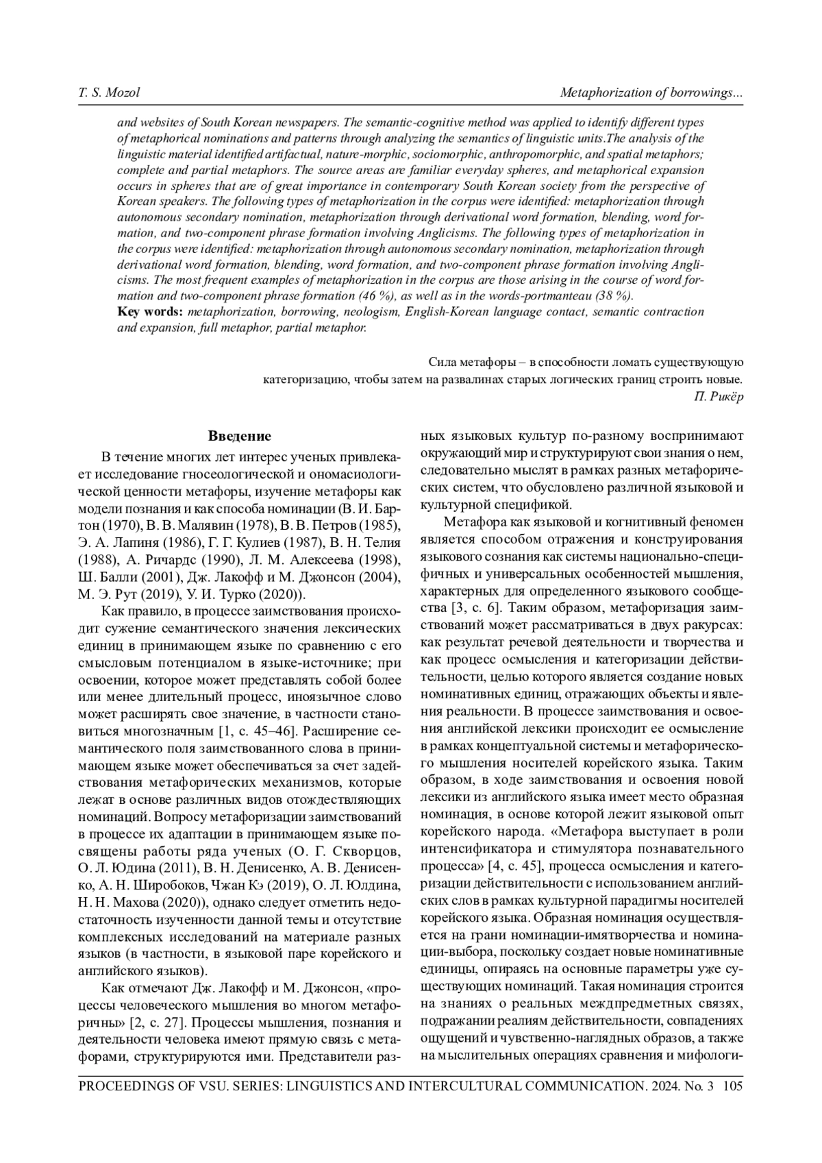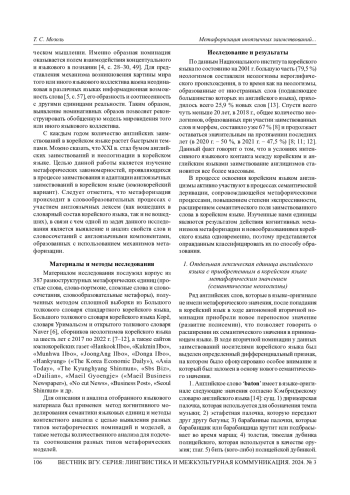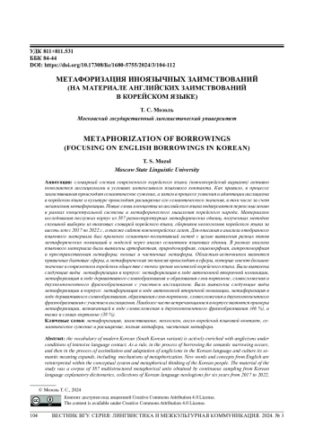 Словарный состав современного корейского языка (южнокорейский вариант) активно пополняется англицизмами в условиях интенсивного языкового контакта. Как правило, в процессе заимствования происходит семантическое сужение, а затем в процессе усвоения и адаптации англицизма в корейском языке и культуре происходит расширение его семантического значения, в том числе за счет механизмов метафоризации. Новые слова и концепты из английского языка подвергаются переосмыслению в рамках концептуальной системы и метафорического мышления корейского народа. Материалом исследования послужил корпус из 387разноструктурных метафорических единиц, полученных методом сплошной выборки из толковых словарей корейского языка, сборников неологизмов корейского языка за шесть лет с 2017 по 2022 г., а также сайтов южнокорейских газет. Для описания и анализа отобранного языкового материала был применен семантико-когнитивный метод с целью выявления разных типов метафорических номинаций и моделей через анализ семантики языковых единиц. В рамках анализа языкового материала были выявлены артефактная, природоморфная, социоморфная, антропоморфная и пространственная метафоры; полные и частичные метафоры. Областью-источником являются привычные бытовые сферы, а метафорическая экспансия происходит в сферы, которые имеют большое значение в современном корейском обществе с точки зрения носителей корейского языка. Были выявлены следующие виды метафоризации в корпусе: метафоризация в ходе автономной вторичной номинации, метафоризация в ходе деривативного словообразования и образования слов-портмоне, словосложения и двухкомпонентного фразообразования с участием англицизмов. Были выявлены следующие виды метафоризации в корпусе: метафоризация в ходе автономной вторичной номинации, метафоризация в ходе деривативного словообразования, образования слов-портмоне, словосложения и двухкомпонентного фразообразования с участием англицизмов. Наиболее часто встречающимися в корпусе являются примеры метафоризации, возникающей в ходе словосложения и двухкомпонентного фразообразования (46 %), а таже в словах-портмоне (38 %).