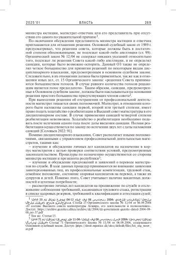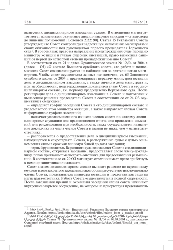 3. Хаммад А., Кантауи А. 2024. Высший совет магистратуры Алжира: между субординацией и независимостью (сравнительное исследование конституционных поправок 2016 и 2020 гг.). - Алжирский журнал права и гуманитарных наук. № 17(1). С. 229-249. [عبد الله حماد، عبد الله كنتاوي. المجلس الأعلى للقضاء الجزائري بين التبعية والاستقلالية (دراسة مقارنة بين التعديلين الدستوريين 2016-2020) // مجلة الحقوق والعلوم الإنسانية. المجلد 17، العدد 1، 2024. ص. 229-249.].