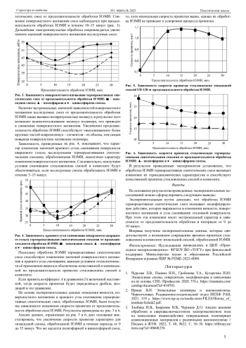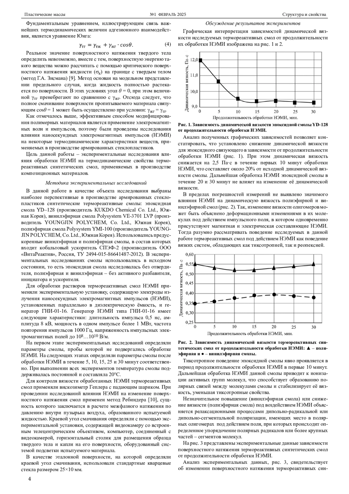 В настоящей работе представлены результаты исследования влияния обработки наносекундными электромагнитными импульсами (НЭМИ) на некоторые термодинамические характеристики полимеров, применяемых в производстве армированных стеклопластиков. Обнаружено, что обработка НЭМИ эпоксидной смолы YD-128, винилэфирной смолы Polysystem VE-3701 LVP, полиэфирной смолы Polysystem YMI-100 оказывает модифицирующее действие. При этом отмечается увеличение скорости пропитки, характерное для эпоксидной смолы, обработанной НЭМИ в течение периода от 0 до 15 минут. Что же касается полиэфирной и винилэфирной смол, то их обработка НЭМИ не приводит к ускорению процесса пропитки.