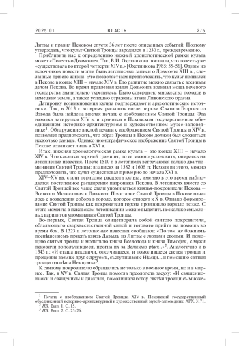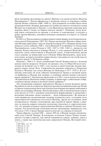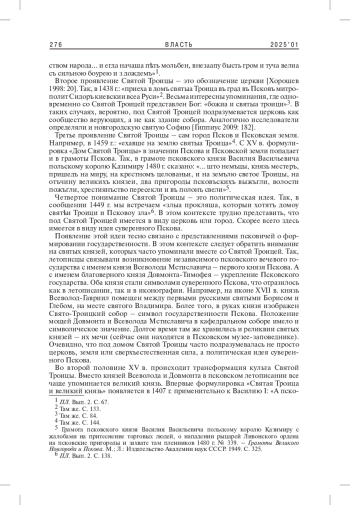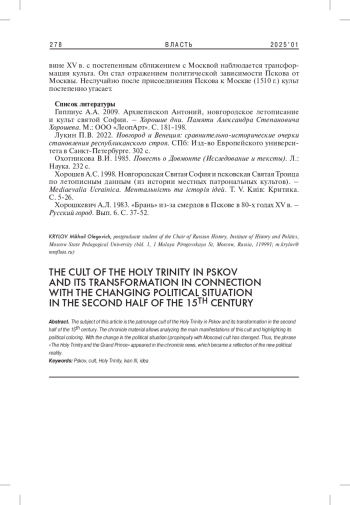 КРЫЛОВ М. О. КУЛЬТ СВЯТОЙ ТРОИЦЫ В ПСКОВЕ И ЕГО ТРАНСФОРМАЦИЯ В СВЯЗИ С ИЗМЕНЕНИЕМ ПОЛИТИЧЕСКОЙ ОБСТАНОВКИ ВО ВТОРОЙ ПОЛОВИНЕ XV В. // ВЛАСТЬ. 2025. ТОМ 33 № 1