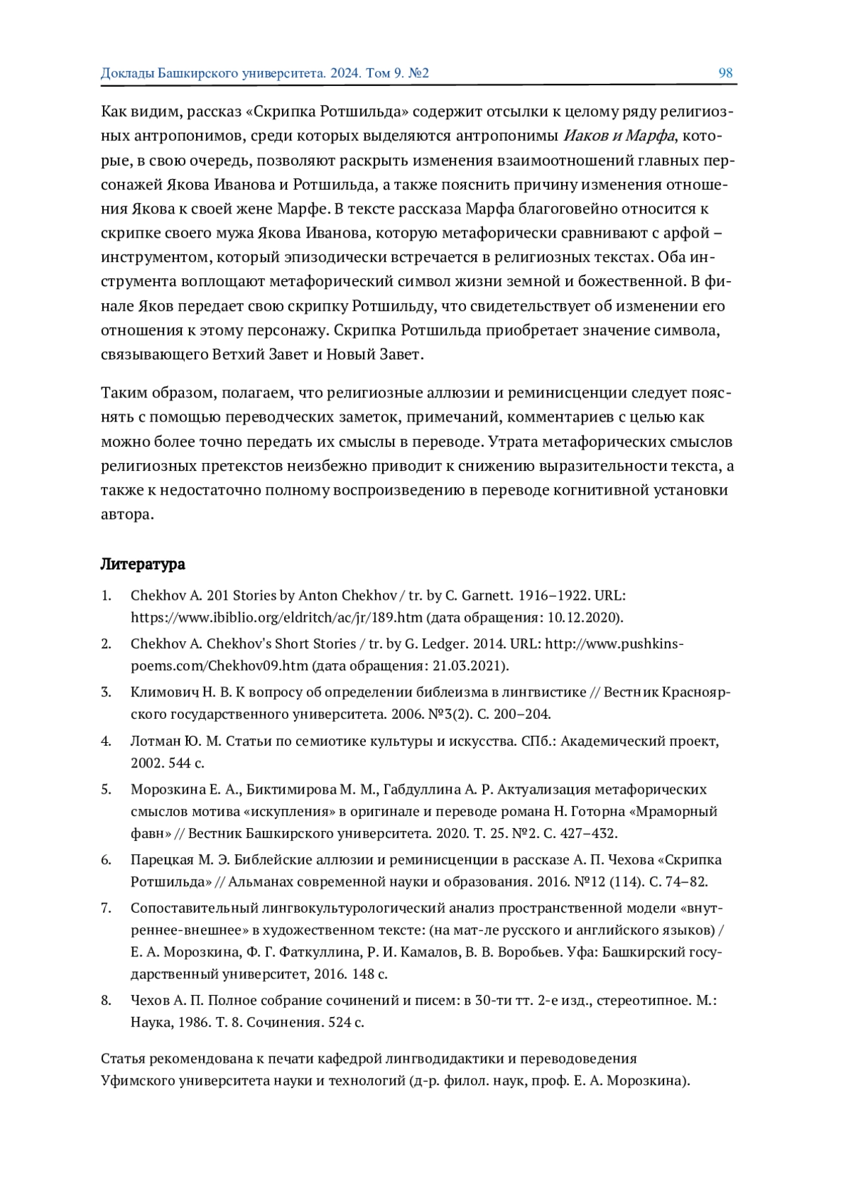 6. Парецкая М. Э. Библейские аллюзии и реминисценции в рассказе А. П. Чехова “Скрипка Ротшильда” // Альманах современной науки и образования. 2016. №12 (114). С. 74-82. EDN: XIKCAL