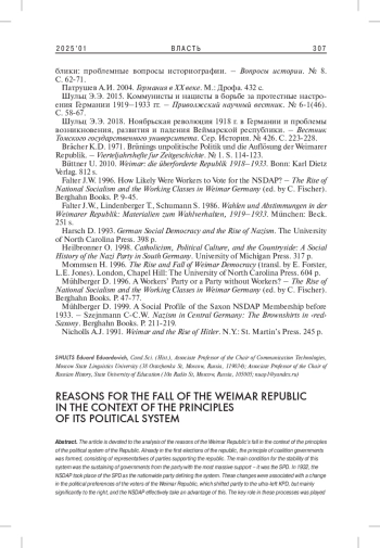 8. Шульц Э.Э. 2018. Ноябрьская революция 1918 г. в Германии и проблемы возникновения, развития и падения Веймарской республики. - Вестник Томского государственного университета. Сер. История. № 426. С. 223-228.