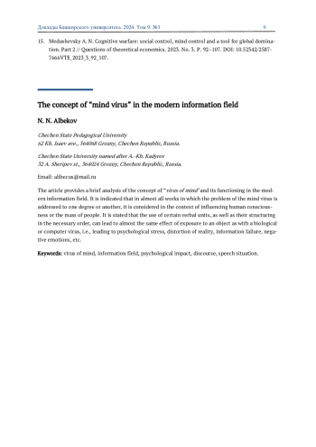 15. Medushevsky A. N. Cognitive warfare: social control, mind control and a tool for global domination. Part 2 // Questions of theoretical economics. 2023. No. 3. P. 92-107. 10.52342/2587- 7666VTE_2023_3_92_107. DOI: 10.52342/2587-7666VTE_2023_3_92_107