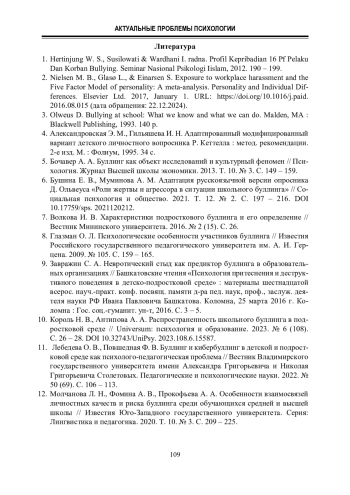 6. Бушина Е. В., Муминова А. М. Адаптация русскоязычной версии опросника Д. Ольвеуса «Роли жертвы и агрессора в ситуации школьного буллинга» // Социальная психология и общество. 2021. Т. 12. № 2. С. 197 - 216. https://doi.org/10.17759/sps.2021120212.