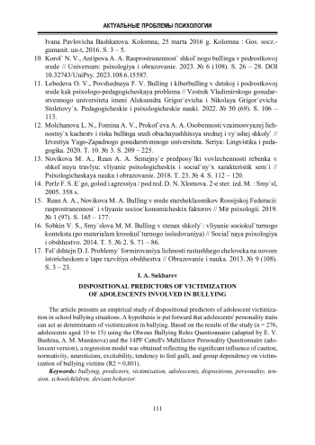 12. Молчанова Л. Н., Фомина А. В., Прокофьева А. А. Особенности взаимосвязей личностных качеств и риска буллинга среди обучающихся средней и высшей школы // Известия Юго-Западного государственного университета. Серия: Лингвистика и педагогика. 2020. Т. 10. № 3. С. 209 - 225.