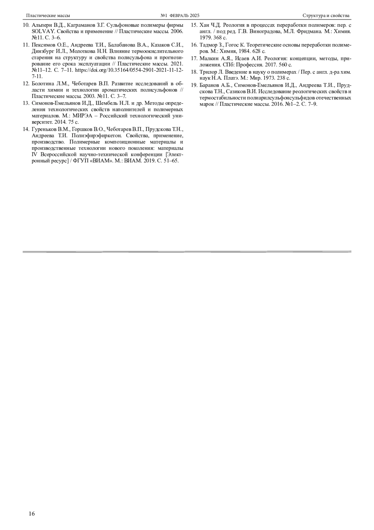 19. Баранов А.Б., Симонов-Емельянов И.Д., Андреева Т.И., Прудскова Т.Н., Сазиков В.И. Исследование реологических свойств и термостабильности полиарилсульфонсульфидов отечественных марок // Пластические массы. 2016. №1-2. C. 7-9.