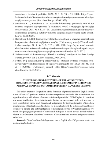 ВЛАСЕНКО Т. Т. ПЕДАГОГИЧЕСКИЙ ПОТЕНЦИАЛ УЧЕБНОГО ЗАДАНИЯ «УСЛОВНЫЙ ДИАЛОГ-ИНТЕРВЬЮ» В ДОСТИЖЕНИИ ЛИЧНОСТНЫХ РЕЗУЛЬТАТОВ ОБУЧЕНИЯ НА УРОКАХ ИНОСТРАННОГО ЯЗЫКА // ВЕСТНИК ВЛАДИМИРСКОГО ГОСУДАРСТВЕННОГО УНИВЕРСИТЕТА ИМ. АЛЕКСАНДРА ГРИГОРЬЕВИЧА И НИКОЛАЯ ГРИГОРЬЕВИЧА СТОЛЕТОВЫХ. СЕРИЯ: ПЕДАГОГИЧЕСКИЕ И ПСИХОЛОГИЧЕСКИЕ НАУКИ. 2025. №1 (79)