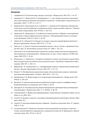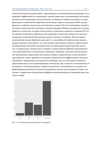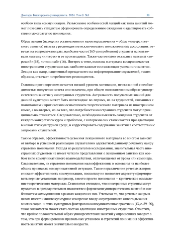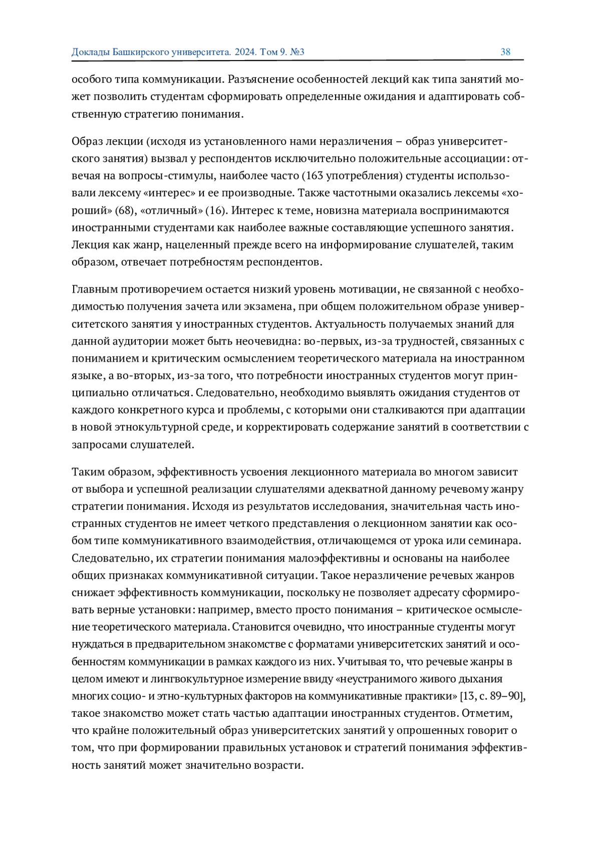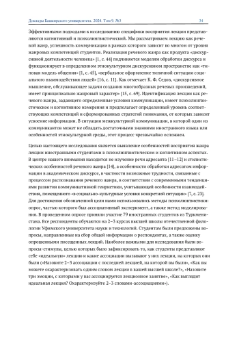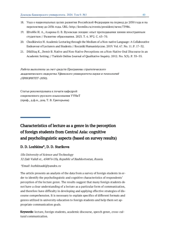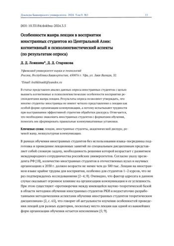 ЛОЖКИНА Д. Д., СТАРИКОВА Д. Д. ОСОБЕННОСТИ ЖАНРА ЛЕКЦИИ В ВОСПРИЯТИИ ИНОСТРАННЫХ СТУДЕНТОВ ИЗ ЦЕНТРАЛЬНОЙ АЗИИ: КОГНИТИВНЫЙ И ПСИХОЛИНГВИСТИЧЕСКИЙ АСПЕКТЫ (ПО РЕЗУЛЬТАТАМ ОПРОСА) // ДОКЛАДЫ БАШКИРСКОГО УНИВЕРСИТЕТА. 2024. Т. 9 № 3
