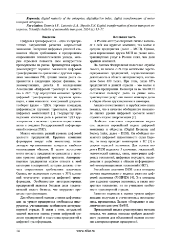 Ключевые фразы: цифровая зрелость предприятия, индекс цифровизации, цифровая транс- формация автотранспортных предприятий