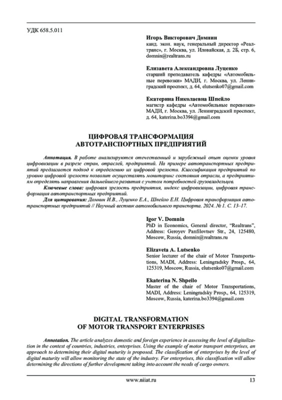 ДОМНИН И. В., ЛУЦЕНКО Е. А., ШПЕЙЛО Е. Н. ЦИФРОВАЯ ТРАНСФОРМАЦИЯ АВТОТРАНСПОРТНЫХ ПРЕДПРИЯТИЙ // НАУЧНЫЙ ВЕСТНИК АВТОМОБИЛЬНОГО ТРАНСПОРТА. 2024. № 1