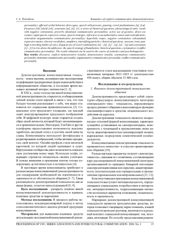 В статье рассматривается феномен коммуникативной демонстративности. Цель исследования состоит в определении понятия явной коммуникативной демонстративности и выявлении языковых средств ее выражения. Используются междисциплинарный подход и метод психолингвистического анализа речевой продукции коммуникантов. Материалом для анализа стали высказывания участников телевизионных интервью 2012-2023 гг. Устанавливается, что явная коммуникативная демонстративность является тональностью взаимодействия, которая выделяется ярким и непосредственным представлением собственного образа говорящего, преувеличением его важных качеств, акцентом на преобладающей эмоции, актуализируется на всех языковых уровнях и реализуется в продуктах речи с помощью применения разнообразных языковых и неязыковых средств. Средствами данной тональной разновидности, которыми продуцент нарратива поддерживает свой имидж, выступают: гиперболические тропы, речевые штампы, заимствованные слова, положительные эпитеты, местоимение «все» и прилагательное «любой» с обобщающим значением (показная коммуникативная личность); аффектированное вербальное поведение, взгляд в упор, речь с напором, паузация, преобладание гласных [у], [ю], шипящих [ш], [щ], [ч], сонорных [м], [н], [р], серии риторических вопросов, фразеологизмы, слова с отрицательной коннотацией, паремии (доминантная коммуникативная личность); активное использование жестов, прямой взгляд в глаза, быстрая речь, экспрессивный синтаксис, речевые стратегии ссылки на авторитетный источник и противоречия, лексический повтор (аргументирующая коммуникативная личность); гиперболические тропы, отрицательная коннотация, субстандартные выразительные средства, обсценная лексика, анафора, интенсифицирующие частицы, риторические вопросы, сарказм, ирония, языковая игра, высокий визжащий тембр голоса, частое употребление комбинации гласных [у] - [а], [ы] - [а], [о] - [а] и согласных [с] - [р] для возвышения над адресатом, речевая стратегия уничижения, риторические вопросы, восклицательные предложения (конфликтная коммуникативная личность). Полученные результаты могут быть использованы в курсе семиотики и психолингвистики.