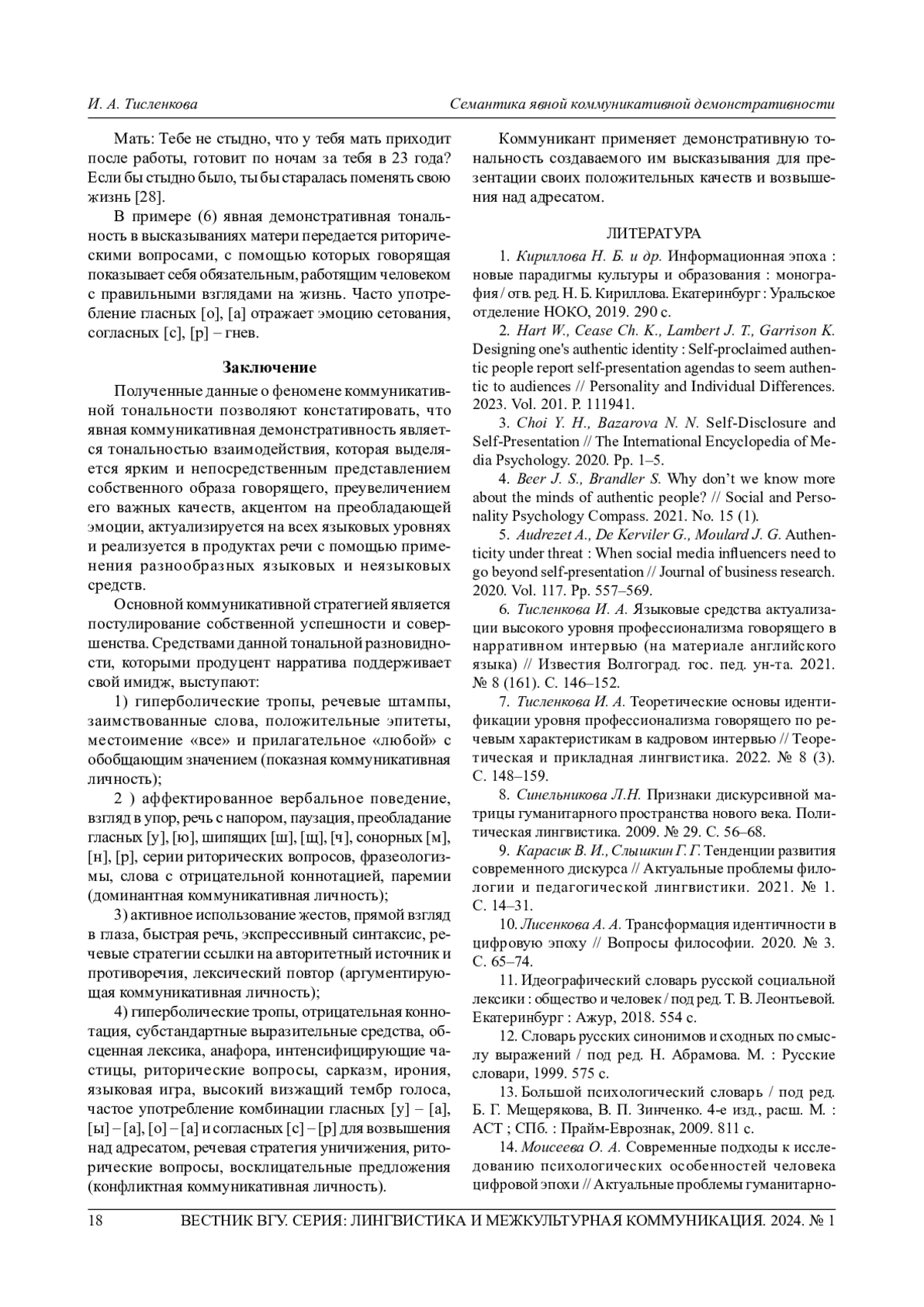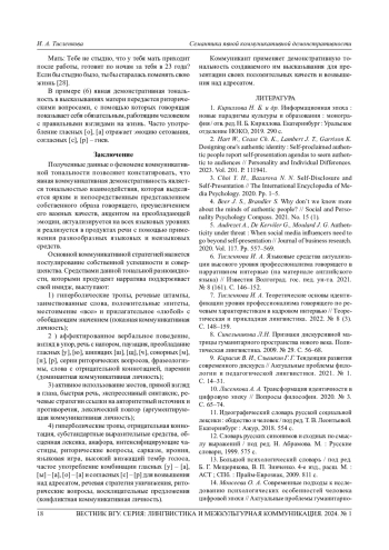18. Колесникова О. И., Козлова Е. А. Дискурсивная личность лидера и ее ценности в эмоциогенной репрезентации // Вестник Волгоград. гос. ун-та. Сер. 2: Языкознание. 2023. Т. 22, № 1. С. 162-172. EDN: LFQHVN