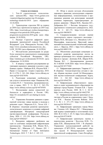 17. Цифровизация транспорта: оценка и перспективы развития / Веселова Ю.В., Гущина П.В., Шакирзянова И.Ф. // В сборнике: Управление эксплуатационной работой на транспорте (УЭРТ-2024). электронный сборник трудов II Международной научно-практической конференции. Санкт-Петербург, 2024. С. 130–132. https://www.elibrary.ru/ item.asp?id=73391257