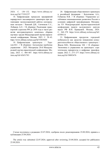 20. Цифровизация общественного транспорта в российской федерации / Бельтюкова А.А., Губанова Н.В. // В сборнике: Управление устойчивым инновационным развитием России в условиях цифровой трансформации. Материалы XV Международной научно-практической конференции памяти заслуженного деятеля науки РФ В.И. Кравцовой. Москва, 2024. С. 268–270 https://www.elibrary.ru/item.asp?id= 65599114