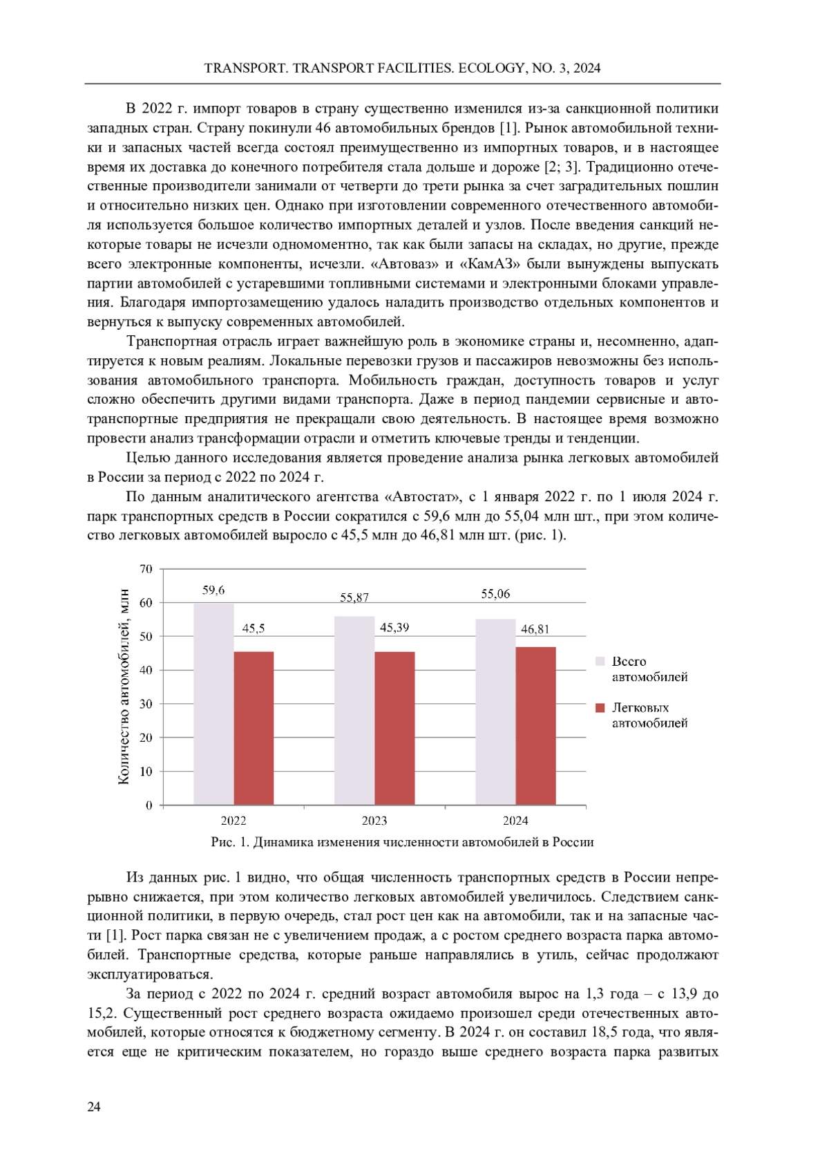 Транспорт играет важную роль как для государства, так и для отдельно взятой семьи. Санкционная политика западных стран оказала существенное влияние на структуру и состав парка легковых автомобилей России. За последние два года страну покинули 46 брендов, усложнилась логистика снабжения запасными частями, увеличились цены. В статье представлен анализ рынка легковых автомобилей в России в период с 2022 г. по настоящее время. В качестве материалов исследования использовались официальные данные автомобильной статистики за указанный период. Проанализирована динамика изменения численности автомобилей в России, а также их состав и средний возраст, изменение структуры продаж новых транспортных средств в сторону увеличения количества китайских автомобилей. Исследована статистика продаж китайских автомобилей по маркам, а также определена их специфика. К основным плюсам китайских производителей можно отнести современный дизайн продукции, широкий ассортиментный ряд, наличие электроники и дополнительных функций, а также развитие дилерской сети в России. Ключевыми недостатками являются сложность поиска запасных частей на непопулярные марки и на автомобили снятые с производства. Также различное программное обеспечение и полное или частичное отсутствие технической документации на техническое обслуживание, ремонт и диагностику транспортных средств. Представлен анализ выхода китайских производителей на российский рынок, проанализированы преимущества и недостатки. Основным подходом для новых брендов остаются продажи через посредников, без официального представительства. В результате исследования установлена динамика изменения парка легковых автомобилей в России, а также специфика развития после введения санкций от западных стран.