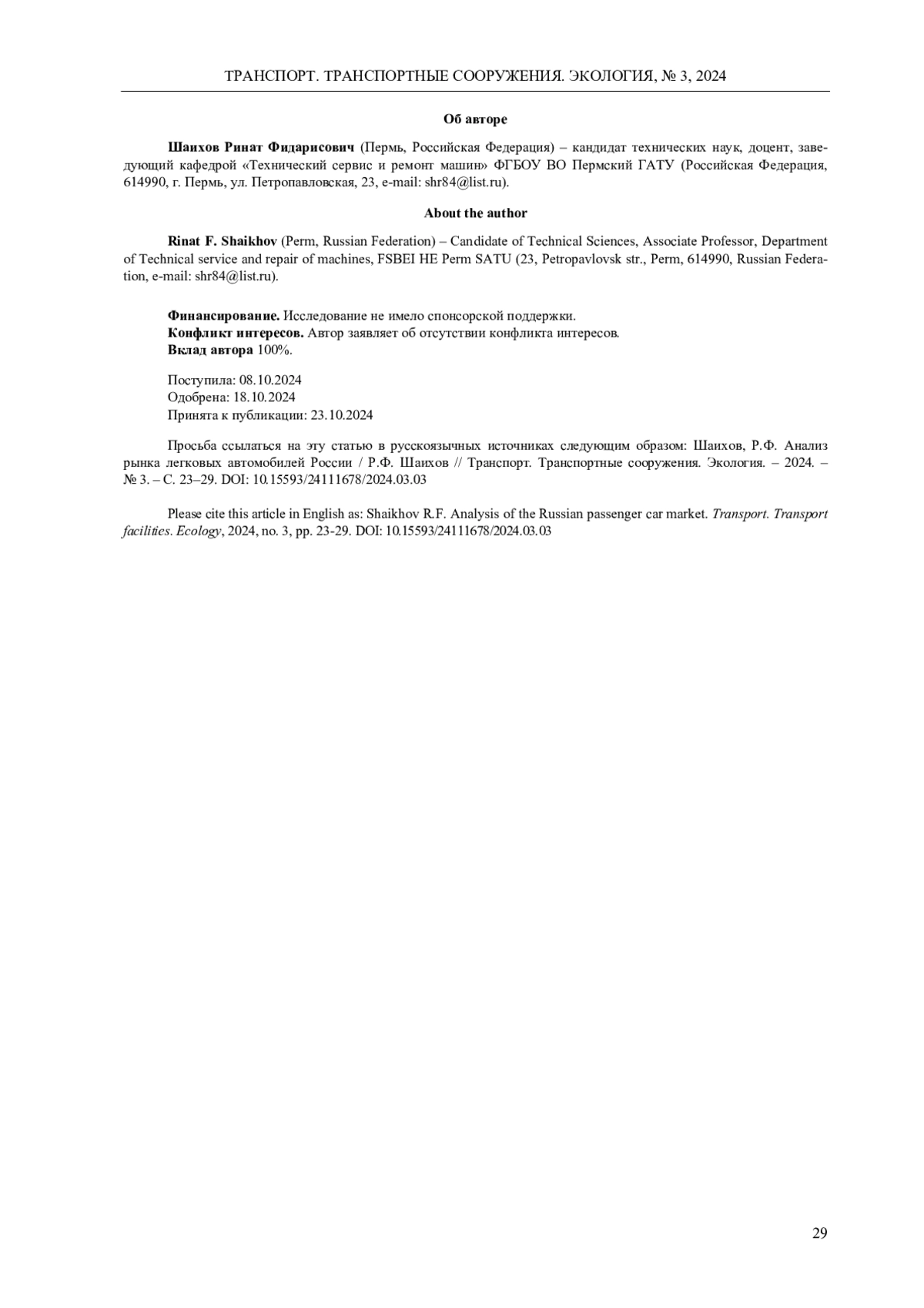 3. Саламатов, А.П. Проблема импорта китайских запасных частей в Россию / А.П. Саламатов, С.А. Пестриков, Д.В. Мальцев // Химия. Экология. Урбанистика. - 2023. - Т. 2. - С. 267-274. EDN: YECNDS