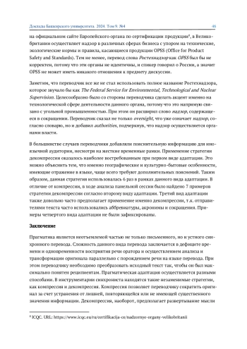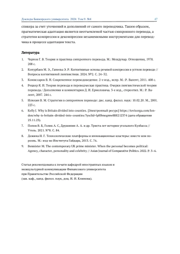 ГАНЕЕВА Э. Р., БАТЮК А. А. РОЛЬ КОМПРЕССИИ И ДЕКОМПРЕССИИ В ПРОЦЕССЕ ПРАГМАТИЧЕСКОЙ АДАПТАЦИИ В СИНХРОННОМ ПЕРЕВОДЕ // ДОКЛАДЫ БАШКИРСКОГО УНИВЕРСИТЕТА. 2024. Т. 9 № 4