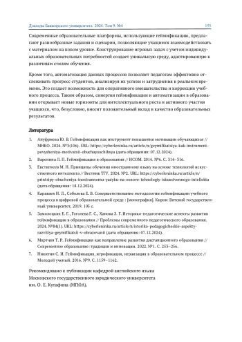 1. Ануфриева Ю. В. Геймификация как инструмент повышения мотивации обучающихся // МНКО. 2024. №3(106). URL: https://cyberleninka.ru/article/n/geymifikatsiya-kak-instrument-povysheniya-motivatsii-obuchayuschihsya (дата обращения: 07.12.2024). EDN: HLSQTA