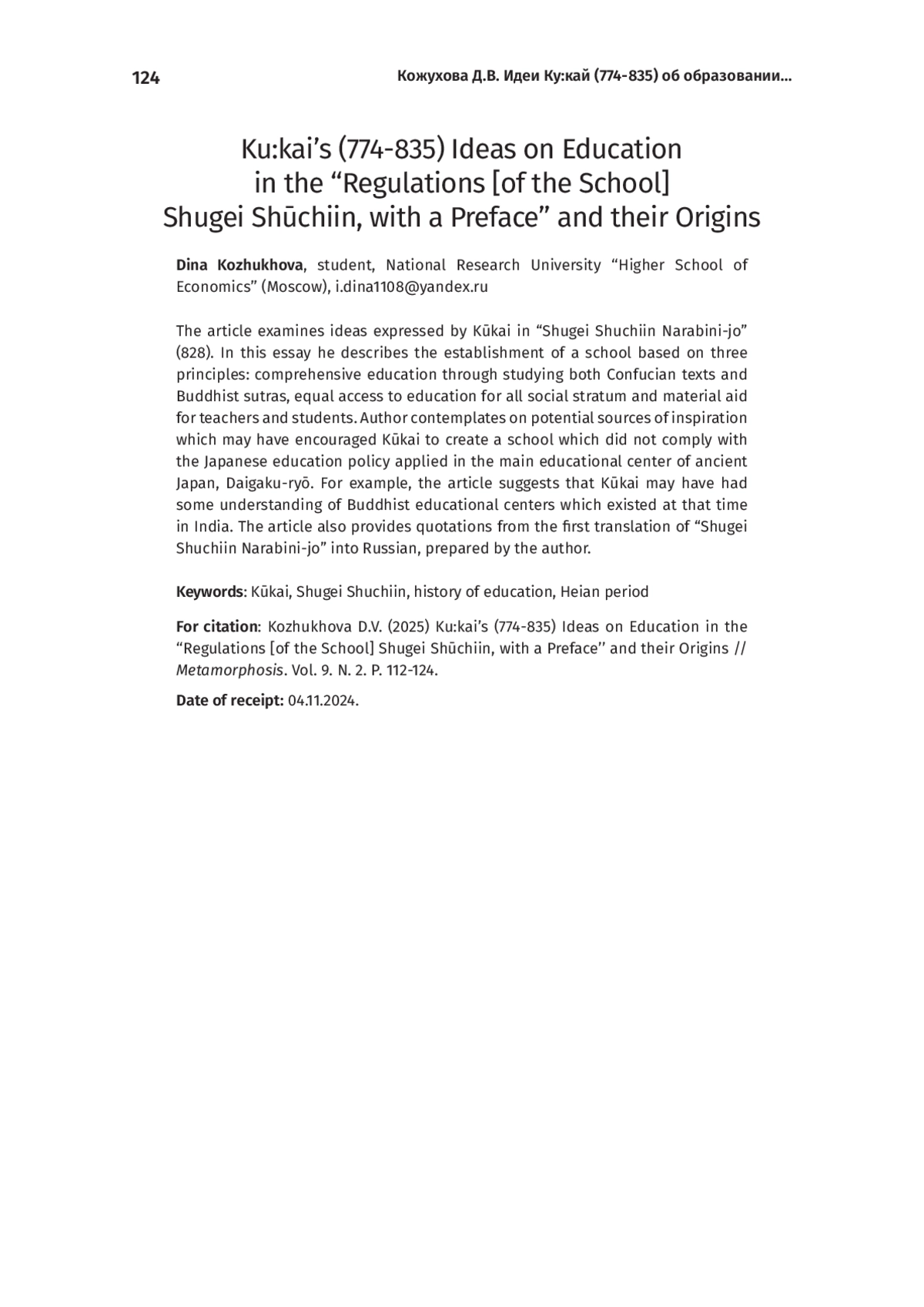 КОЖУХОВА Д. ИДЕИ КУ: КАЙ (774-835) ОБ ОБРАЗОВАНИИ В «РЕГЛАМЕНТЕ [ШКОЛЫ] СЮГЭЙ СЮТИИН, С ПРЕДИСЛОВИЕМ» И ИХ ИСТОКИ // МЕТАМОРФОЗИС. 2025. ТОМ 9, № 2