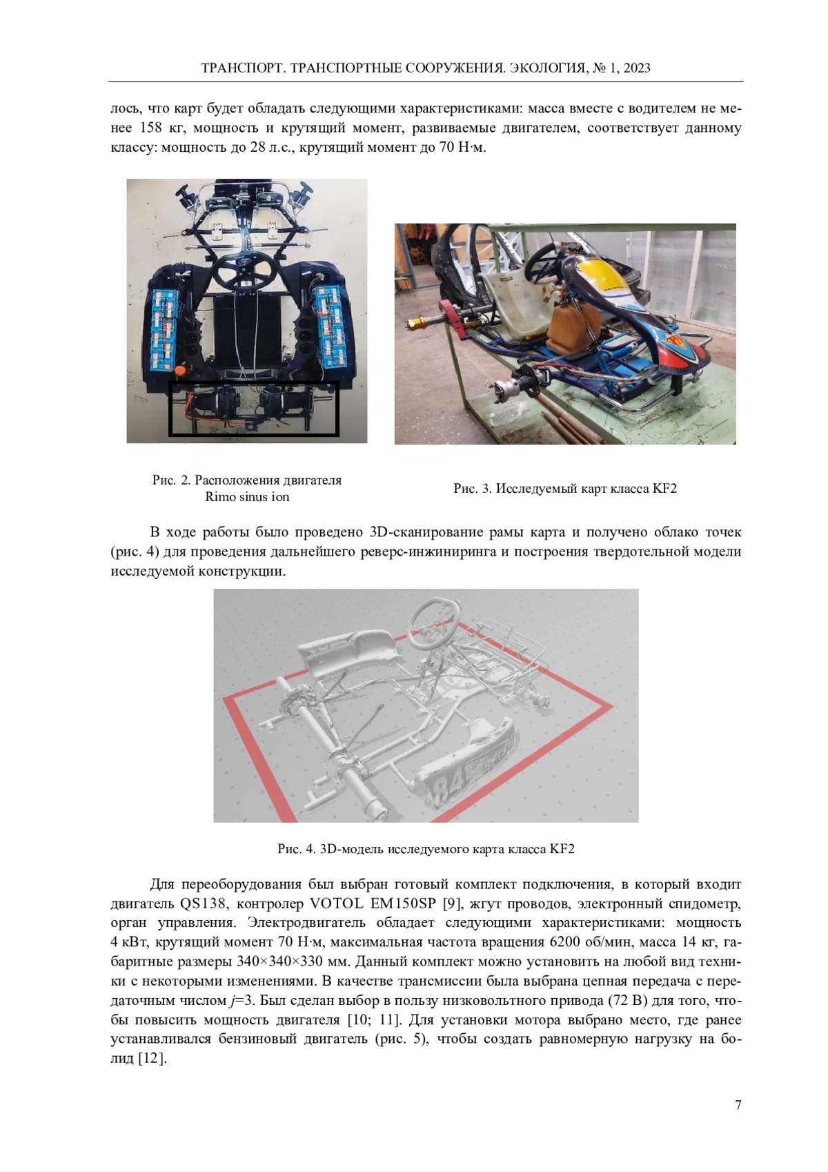 Тенденции развития автомобильного транспорта - переход к снижению углеродного следа. Применение электрической силовой установки является наиболее перспективным для решения поставленной задачи. Не исключение в данном случае спортивные автомобили, в том числе картинг. Проведен анализ актуальности электрокартинга на сегодняшний день, определены преимущества над традиционным картом с двигателем внутреннего сгорания, рассмотрено, в каких сферах применяется электрокартинг, а также осуществлено исследование международной классификации картингов, где определено, в каком классе лучше всего принимать участие. Рассмотрены основные производители спортивных электрокартингов в мире, изучены особенности их конструкции, исследовано расположение силовой установки и построение рамы. Определены пути перевода традиционного карта с двигателем внутреннего сгорания на электрическую тягу. Выбрана электрическая силовая установка, которая будет устанавливаться на место традиционного двигателя. Было сделано 3D-сканирование из облака точек для дальнейшего реверс инжиниринга и построение твердотельной модели, рассчитаны и разработаны основные узлы для установки электрического мотора на раму карта класса KF2. По полученным расчетам была построена твердотельная модель, которая устанавливается на раму болида без изменения конструкции для сохранения её прочностных свойств. Для проверки расчетов и твердотельной модели выбрана программа «КОМПАС APM FEM», где были заданы нагрузки на твердотельную модель. Проверка показала, что твердотельная модель может использоваться на данном болиде без внесения изменения в конструкцию рамы. Построена твердотельная модель болида, на которой расположен электродвигатель.