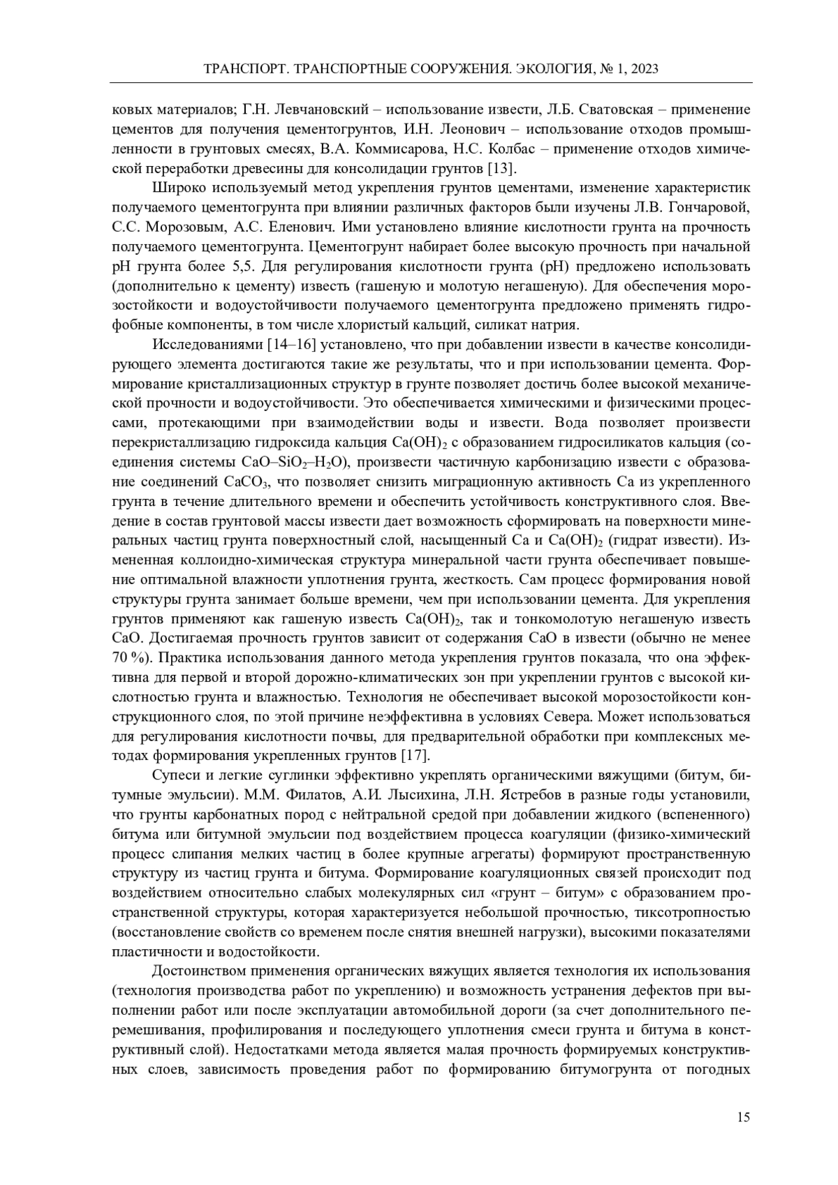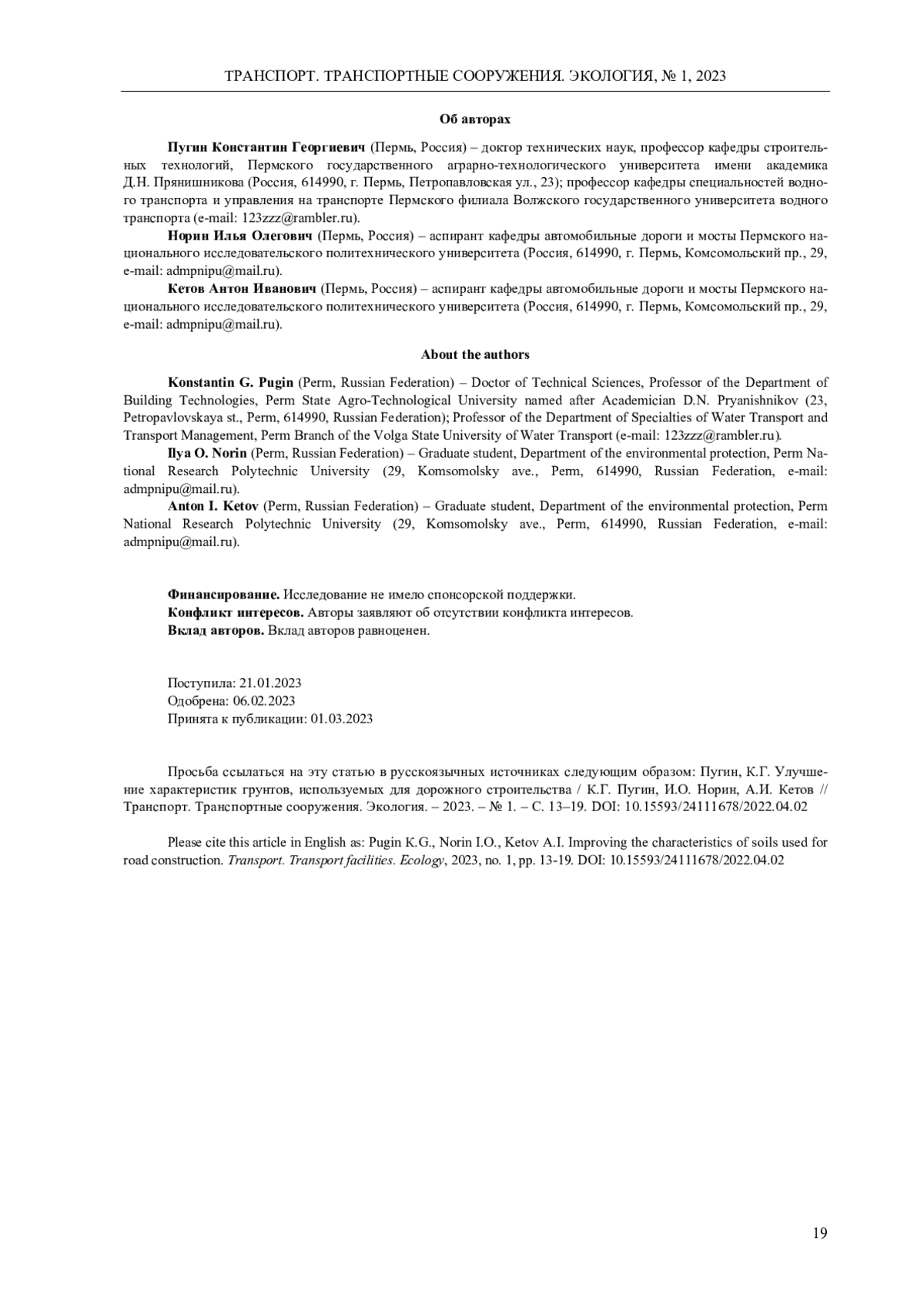 ПУГИН К. Г., НОРИН И. О., КЕТОВ А. И. УЛУЧШЕНИЕ ХАРАКТЕРИСТИК ГРУНТОВ, ИСПОЛЬЗУЕМЫХ ДЛЯ ДОРОЖНОГО СТРОИТЕЛЬСТВА // ТРАНСПОРТ. ТРАНСПОРТНЫЕ СООРУЖЕНИЯ. ЭКОЛОГИЯ. 2023. № 1