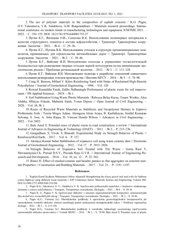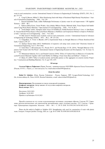 САЛАХОВ Р. Р. УКРЕПЛЕНИЕ ГРУНТОВ, ИСПОЛЬЗУЕМЫХ ДЛЯ СТРОИТЕЛЬСТВА АВТОМОБИЛЬНЫХ ДОРОГ, ОТХОДАМИ ПЛАСТИКА // ТРАНСПОРТ. ТРАНСПОРТНЫЕ СООРУЖЕНИЯ. ЭКОЛОГИЯ. 2023. № 1