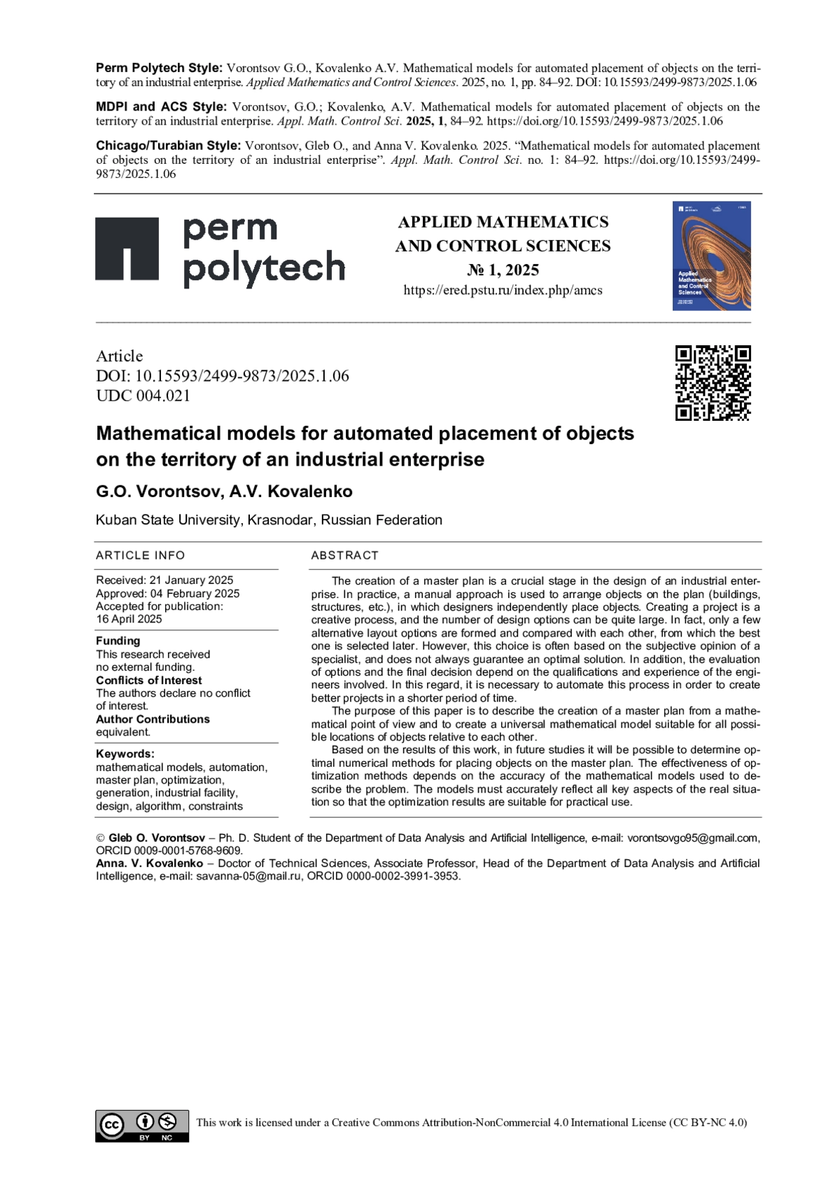12. Коваленко, А.В. Оптимизация компоновки завода с помощью алгоритма машинного обучения / А.В. Коваленко, Г.О. Воронцов // Прикладная математика: современные проблемы математики, информатики и моделирования: мат. V Всероссийской научно-практической конференции молодых ученых, Краснодар, 11-15 апреля 2023 года. - Краснодар: ФГБУ “Российское энергетическое агентство” Минэнерго России Краснодарский ЦНТИ - филиал ФГБУ “РЭА” Минэнерго России, 2023. - С. 380-383. EDN: AJOFFY